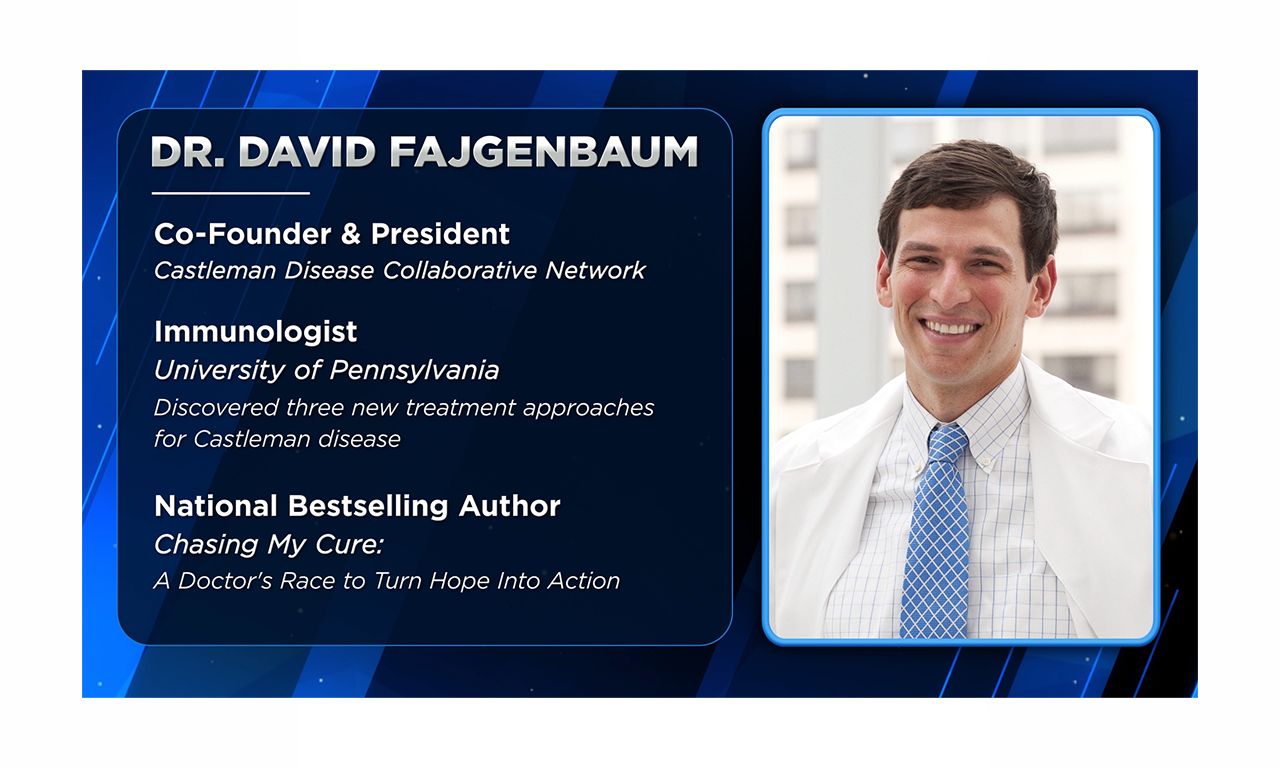 Dr. David Fajgenbaum, MD, MBA, MSc is an immunologist, professor, speaker, and national bestselling author. He is one of the youngest individuals ever appointed to the faculty at Penn Medicine, and has been recognized for his work on an international scale by the likes of The New York Times, Good Morning America, CNN, the Today Show, Forbes 30 Under 30, among others.